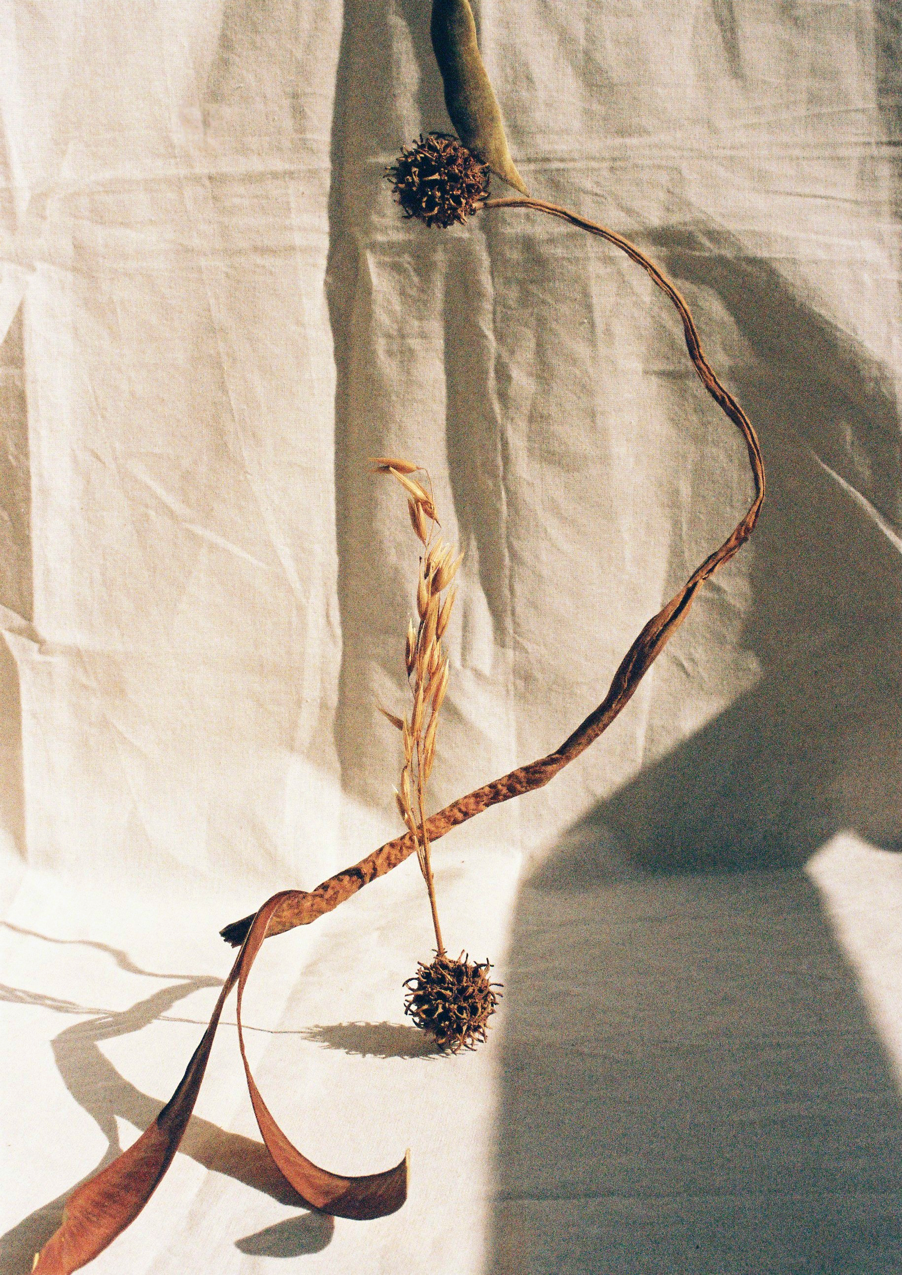 Through the interplay of leaves, flowers, fruits, eggshells, and found objects, I delve into the cycles of